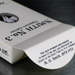 La signature de M.D. Smith a été soigneusement reproduite à partir d’un exemplaire retrouvé dans les collections privées du Conjuring Arts Research Center. L’as de pique évoque le visage de Mr Smith et l’étui est découpé pour pouvoir voir Mr Smith lorsque le jeu est à l’intérieur.
