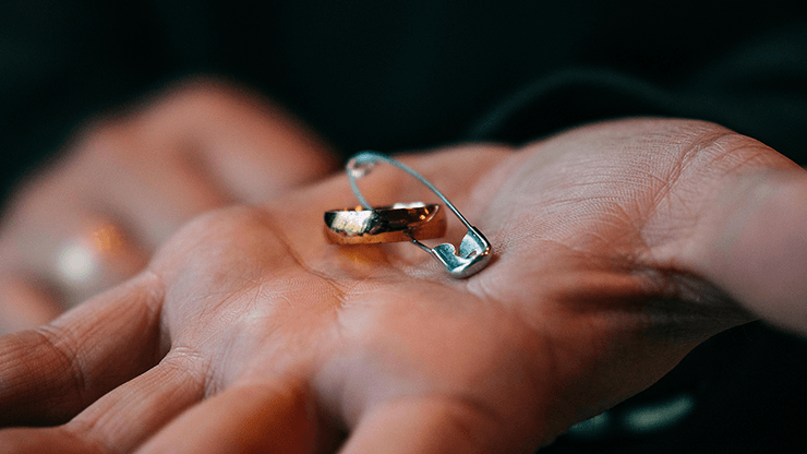 Une épingle à nourrice ordinaire est examinée de près par le public. Une bague est empruntée.