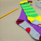 Le spectateur retourne les deux chaussettes choisies : elles ne correspondent pas du tout ! Des étoiles jaunes sur une chaussette et des rayures violettes sur l’autre.