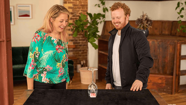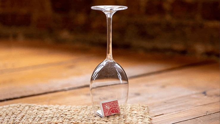Une carte pliée, qui a été emprisonnée sous un verre à vin transparent bien en vue, se révèle être une carte nommée par un spectateur.
