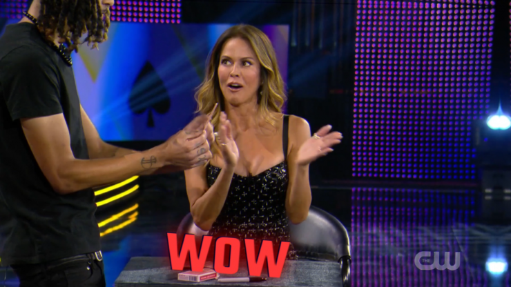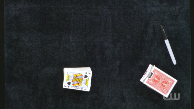 Le public choisit une carte dans le jeu. La carte est placée au milieu du jeu et saute de manière impossible jusqu’en haut du jeu. Pour s’assurer qu’il n’y a pas de doublons, la carte est signée, puis le public la pousse au milieu du jeu, et elle remonte sur le dessus. Dans un dernier moment, franchement insensé, la carte est placée face visible au milieu du jeu. Le jeu est posé sur la table ou même sur le sol. Sur ordre du magicien, la carte signée apparaît visuellement sur le dessus du jeu et peut être offerte en souvenir.