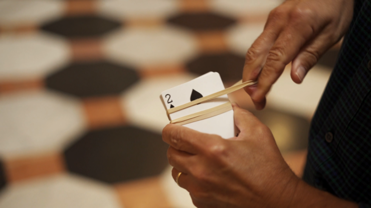 Vous invitez un spectateur à examiner et mélanger librement le jeu. Le jeu est ensuite entouré d’un élastique et lancé dans le public. Les spectateurs regardent librement une carte quelque part dans le jeu. Vous devinez instantanément les cartes qu’ils ont en tête.