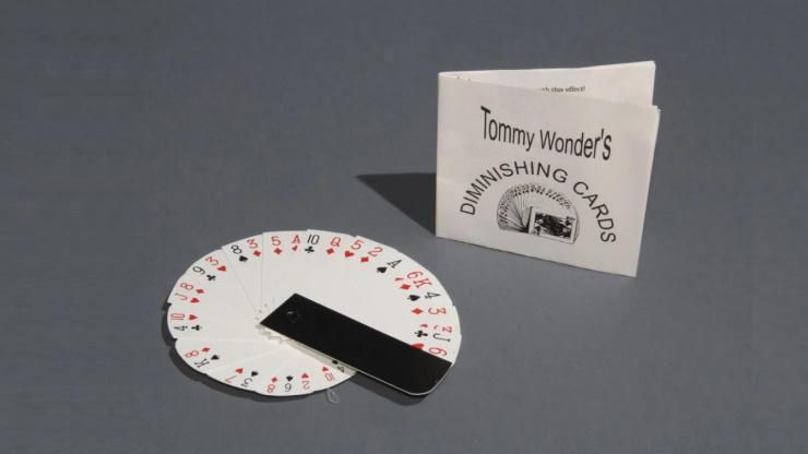 Il s’agit de l’effet classique « Diminishing Cards », mais complètement revu par Tommy Wonder. Le gimmick est ingénieux et permet un effet extrêmement visuel. Les cartes sont tenues dans un joli éventail et deviennent progressivement plus petites à la vue de tous. Il n’y a pas d’écrasement ni d’échange de cartes. L’éventail rétrécit simplement, y compris les faces et les index des cartes. Ce gimmick astucieux fait tout cela.