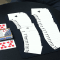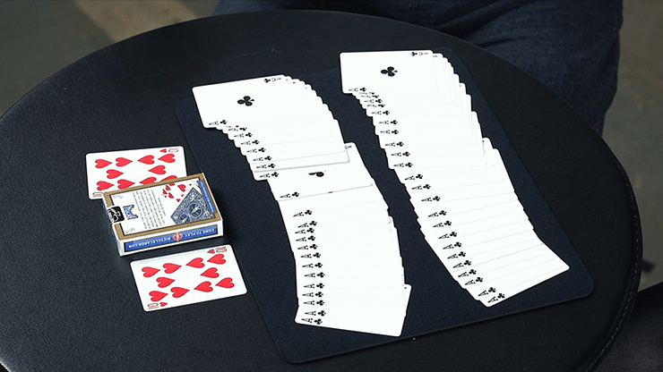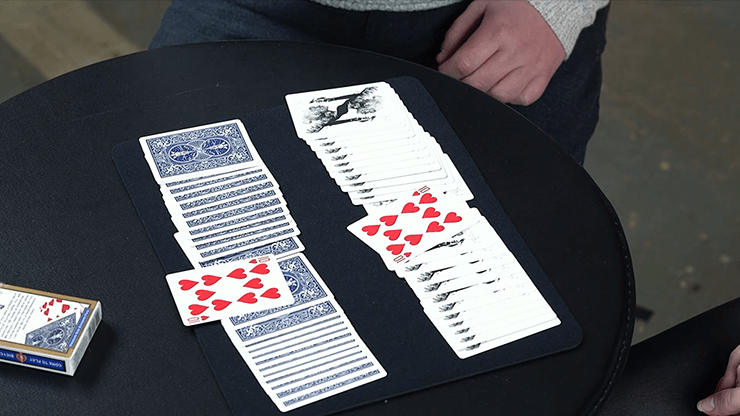 Vous prenez 26 cartes d’un jeu de cartes, et votre spectateur en prend 26 d’un autre jeu. Vous mélangez tous les deux votre paquet. Avec vos cartes dans le dos, vous vous passez mutuellement une carte au hasard et la glissez dans votre demi-paquet.