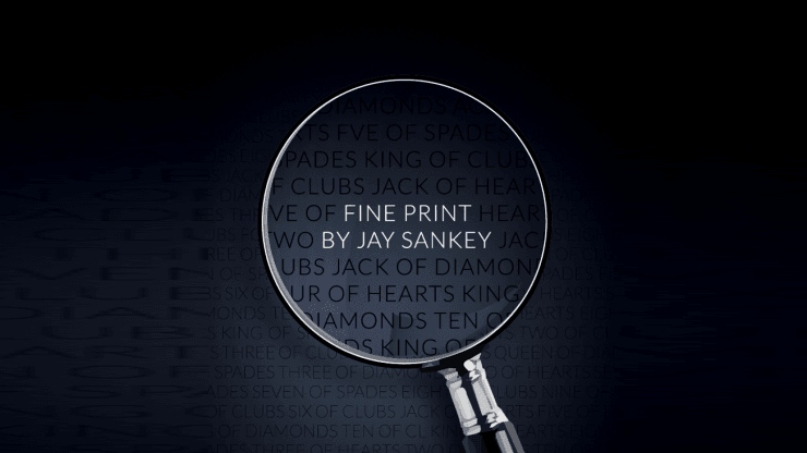 Que vous souhaitiez faire parler ou faire vivre à votre public des montagnes russes émotionnelles, Fine Print est une bombe à retardement. Il suffit de glisser l’un des gimmicks dans votre jeu (remplacez votre as de pique habituel) et vous êtes prêt à partir. Avec cette nouvelle version de luxe, vous obtenez QUATORZE gimmicks, en dos de vélo rouge et bleu, avec QUATRE révélations différentes, donc à moins que vous ne les donniez comme souvenirs, ils dureront très longtemps.
