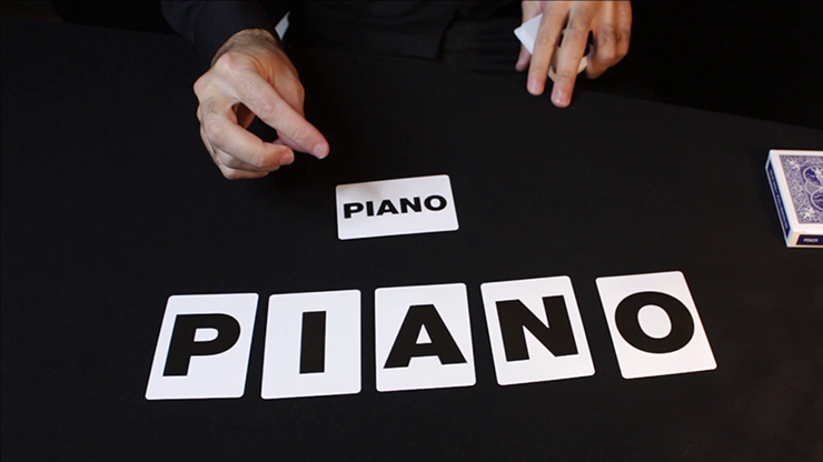 Test de vision : Vous présentez à votre spectateur une carte sur laquelle il y a des lettres de différentes tailles pour faire un test de vision. Puis 16 cartes avec différentes lettres sont mises sur la table face en l’air et face en bas.Le spectateur va alors rassembler les cartes comme il le souhaite en retournant les cartes de son choix. On récupère toutes les cartes face en bas et on demande au spectateur d’écrire un mot avec ces lettres. Le mot constitué apparaît sur la carte du test de vision qui était visible depuis le début.
