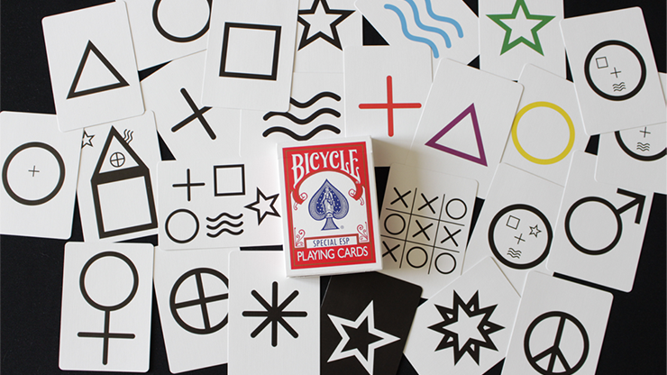 Le jeu SPECIAL ESP est un assortiment de cartes format poker comprenant 25 cartes ESP standard ainsi que 31 cartes gaff imprimées sur les cartes les plus utilisées dans le monde de la magie : les jeux Bicycle Rider back.