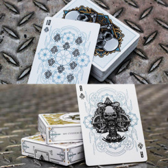 Mélangeant crânes, engrenages et autres artefacts, le dessin des cartes vous fascinera. Un magnifique travail sur les détails qui révèlent une atmosphère dérangeante grâce au mélange des dorures et tons argentés sur fond noir.