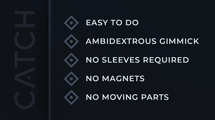 Une fois que la pièce est bien fixée dans le gimmick « Catch », un système de verrouillage innovant la maintient en place jusqu’à ce que vous souhaitiez la libérer. Non seulement « Catch » fait disparaître les pièces, mais il vous permet également de les produire, ce qui en fait l’outil parfait pour les transpositions, les changements ou tout autre tour de pièces préféré.