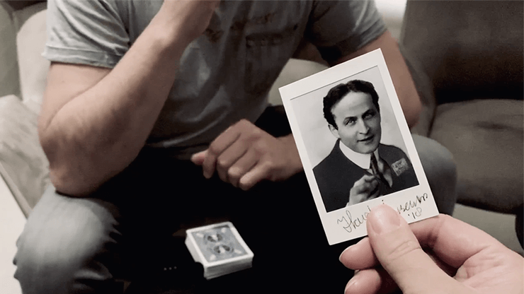 Comme si l’esprit d’Houdini était passé, votre spectateur ressent une étrange sensation… lorsque vous lui demandez d’ouvrir ses mains et de regarder à nouveau la photo de près, la carte qu’il a choisie apparaît maintenant et se révèle à l’intérieur de la poche de veste d’Houdini sur la photo !