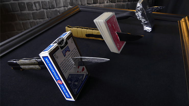 Une carte est sélectionnée, signée et replacée dans le jeu. Après avoir mélangé le jeu et l’avoir replacé dans la boîte à cartes, le magicien prend un couteau et le plante à travers toutes les cartes. Soudain, le couteau glisse rapidement sur le c?’té avec une seule carte poignardée, et bien s? »r, c’est la carte signée.