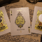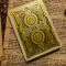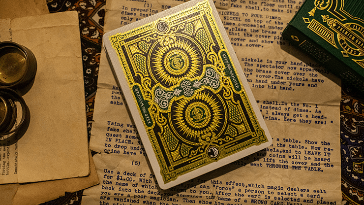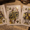 Les étuis ont été imprimés en Grèce par Oath Playing Cards sous étroite surveillance afin de garantir la meilleure qualité possible. Les deux éditions tuck présentent une feuille d’or avec de l’encre noire sur du papier coloré (vert et violet) et un gaufrage très profond.