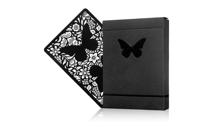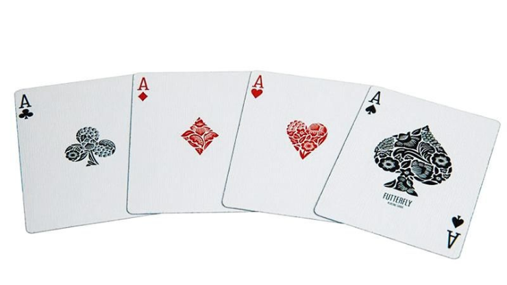 Les jeux Futterfly comprennent 54 cartes et un double dos. Ils sont imprimés par Cartamundi sur du papier cartonné Slimline avec une finition True Linen B9. Ces cartes ne sont pas marquées, ce qui les rend adaptées aux jeux de cartes.