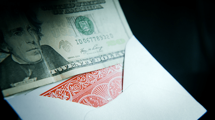Une enveloppe ordinaire est librement présentée sur tous les côtés et est placée sur la table. Une carte est sélectionnée, signée et ensuite perdue dans le jeu. Vous affirmez qu’à l’intérieur de l’enveloppe se trouve un billet de 20 dollars (n’importe quelle devise peut être utilisée). Si vous ne trouvez pas la carte, ils peuvent garder l’argent.