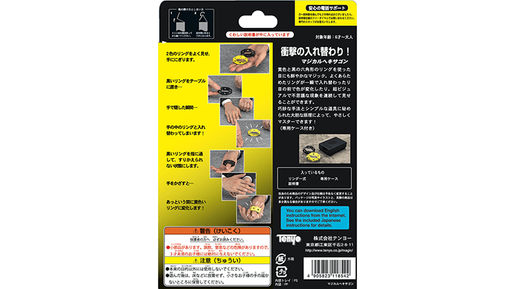 Ce tour utilise deux anneaux hexagonaux, un jaune et un noir. Chaque anneau est percé d’une série de trous. Après avoir montré l’avant et l’arrière de chaque anneau, ils changent instantanément de place et de couleur de manière de plus en plus visuelle et surprenante. Vous pourrez maîtriser ce tour en un rien de temps grâce à la méthode astucieuse et au principe audacieux des accessoires simples.