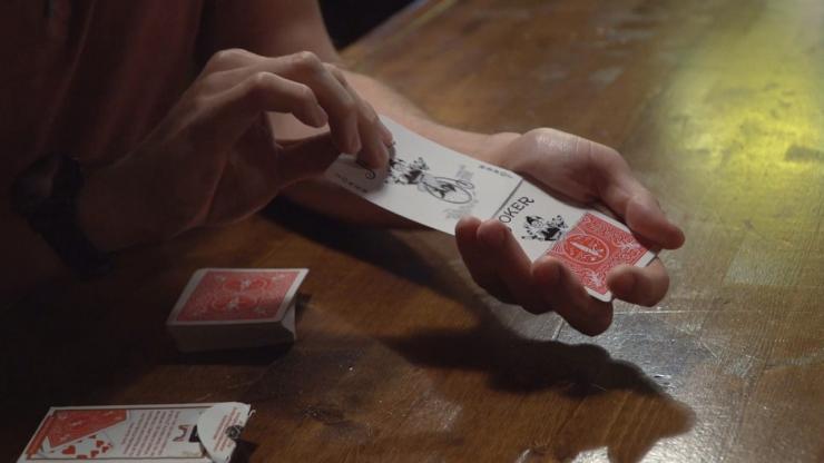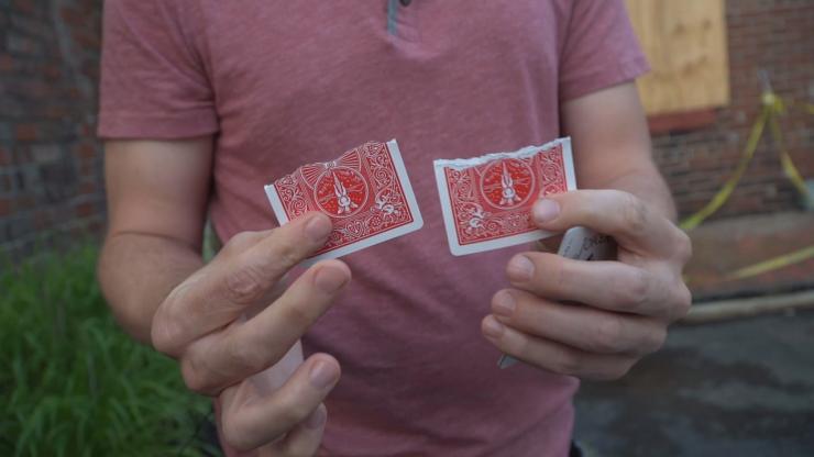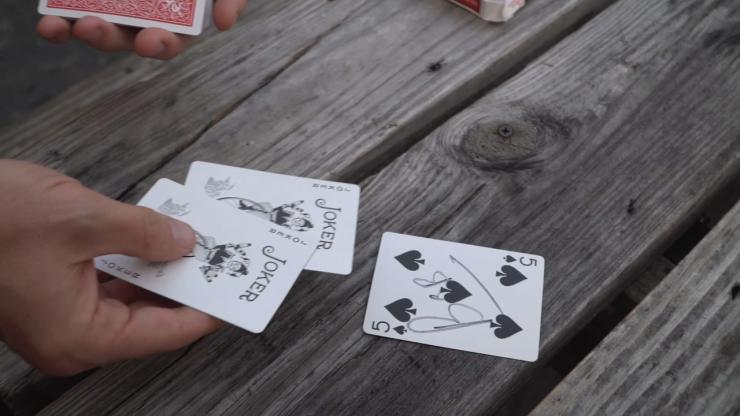 Une carte librement choisie est signée, puis clairement déchirée. Elle est reconstituée pièce par pièce entre les deux jokers.