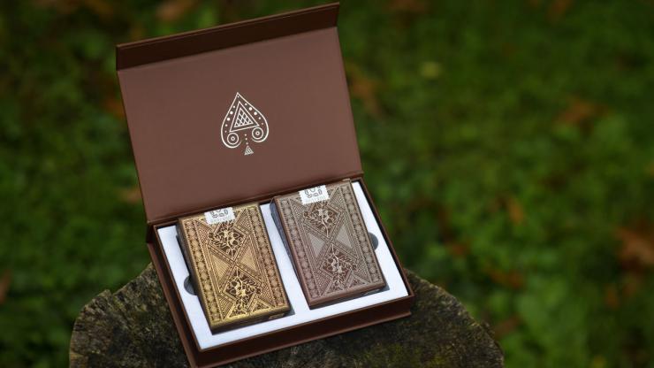 Le jeu standard contient les superbes cartes avec une illustration 100 % personnalisée, 2 jokers et 2 cartes de gaffe à l’intérieur d’une superbe boîte blanche et marron avec un sceau autocollant numéroté individuellement. Le jeu de cartes ? » Gilded ? » (doré) présente de superbes bordures en bronze foncé sur les cartes.La boîte est fabriquée à partir d’un luxueux papier brun chocolat dont le motif est estampillé à la feuille d’or. Le sceau autocollant est également numéroté pour correspondre au jeu de cartes standard.