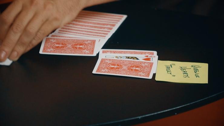 Le public reçoit un jeu de cartes à mélanger et à examiner avant le début du tour, tandis qu’il place ouvertement une prédiction sur la table. Le magicien donne ensuite au spectateur le jeu de cartes à mélanger sous la table. Il prend la carte qu’il veut dans le jeu, la retourne, puis la remet dans le jeu. Il peut ensuite mélanger à nouveau le jeu, toujours sous la table, avant de le reposer sur la table. Le jeu est étalé, et bien que le public ait eu le contrôle du jeu pendant tout ce temps, lorsque le jeu est étalé, la seule carte face visible du jeu est celle qui est écrite sur la prédiction. La carte face visible est retirée du jeu avec les cartes de chaque côté. Le public choisit librement l’une des cartes qui entourent les prédictions. Cette carte est retournée, et elle correspond à une autre prédiction qui a été écrite de l’autre côté de la prédiction originale ouverte.