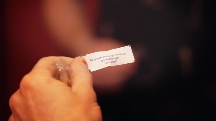 Le magicien offre une sélection de biscuits chinois après qu’une carte a été choisie et mémorisée. Chacun ouvre son biscuit et lit sa fortune à haute voix pour que le groupe l’entende, puis joue au jeu d’après-dîner qui consiste à ajouter une phrase humoristique à la fin de la fortune. Après avoir bien ri, le magicien explique à son public informel que les personnes qui écrivent les biscuits chinois font souvent de leur mieux pour intégrer des messages cachés dans la fortune elle-même. Le magicien prend la fortune de la personne qui a choisi la carte et la plie en quatre. Lorsque le pli est révélé, les lettres s’alignent, de sorte qu’à l’intérieur de la fortune originale se trouve l’identité de la carte sélectionnée avant même qu’aucun des biscuits n’ait été ouvert.