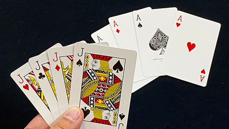 Le magicien tient quatre as dans sa main et montre quatre valets sur la table. Le charismatique valet de c? »ur est placé face cachée sur les quatre as. Le magicien ordonne : « Attention ! » Étonnamment, tous les as se retournent face cachée en réponse au pouvoir du valet. Un autre ordre : « Arrondissez-les ! » Soudain, tous les as de la main du magicien se transforment en valets. Les as se trouvent maintenant sur la table.