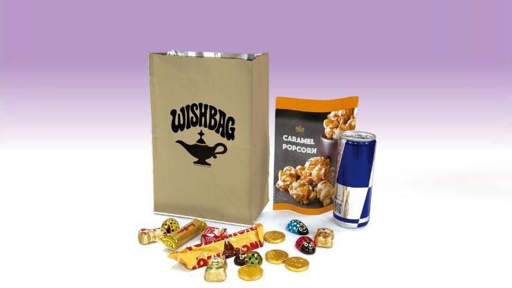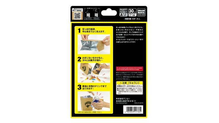 Après avoir montré un sac en papier vide sous tous les angles, vous lancez une formule magique… et, à la surprise générale, une multitude de friandises — et même une vraie boisson en canette — en sortent !